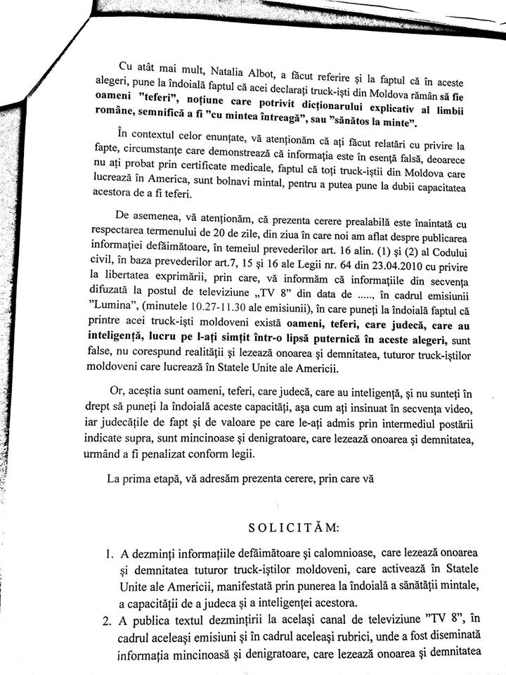 În al doilea rând, se cere ca textul dezmințirii să fie prezentat la același canal de televiziune TV8, în cadrul aceleiași emisiuni unde a fost făcută declarația minciunoasă și denigratoare care lezează onoarea și demnitatea tuturor șoferilor de truck moldoveni care activează în SUA.