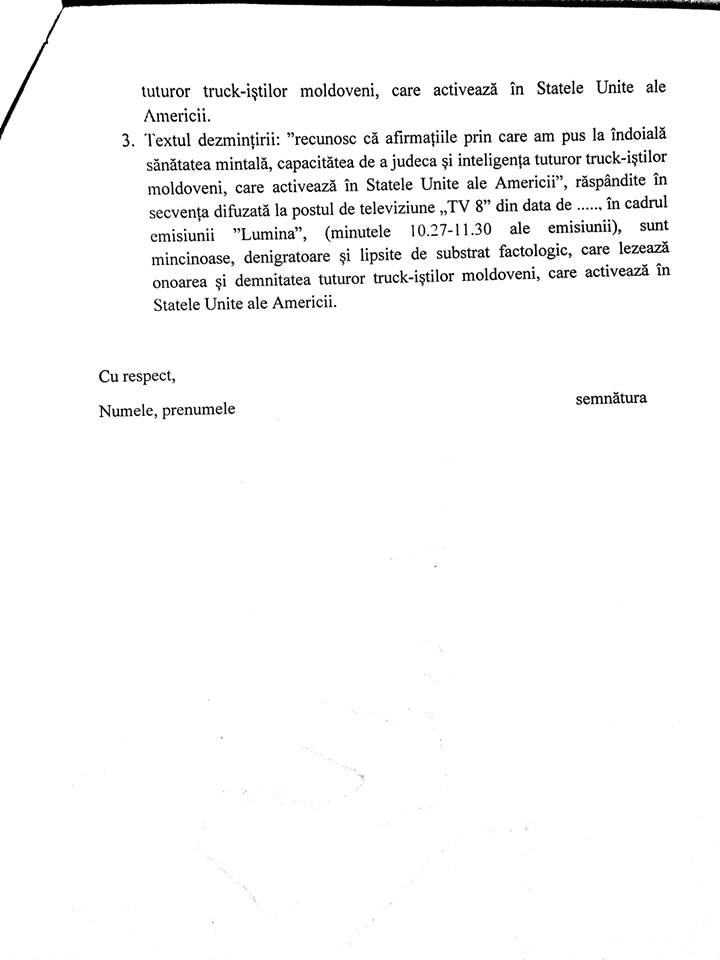 În punctul trei se oferă și textul dezmințirii, „recunosc că afirmațiile prin care am pus la îndoială sănătatea mintală, capacitatea de a judeca și inteligența tuturor truck-iștilor moldoveni care activează în SUA sunt mincinoase, denigratoare și lipsite de sustrat factologic, care lezează onoarea și demnitatea tuturor truck-iștilor moldoveni ce activează în SUA”.