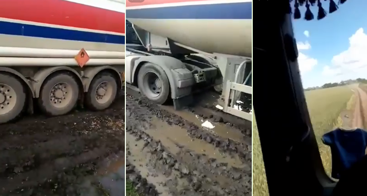 Într-o altă înregistrare video observăm că autocisterna se deplasează pe un drum de câmp, impracticabil pentru așa transport greu și cu gabarit mare.