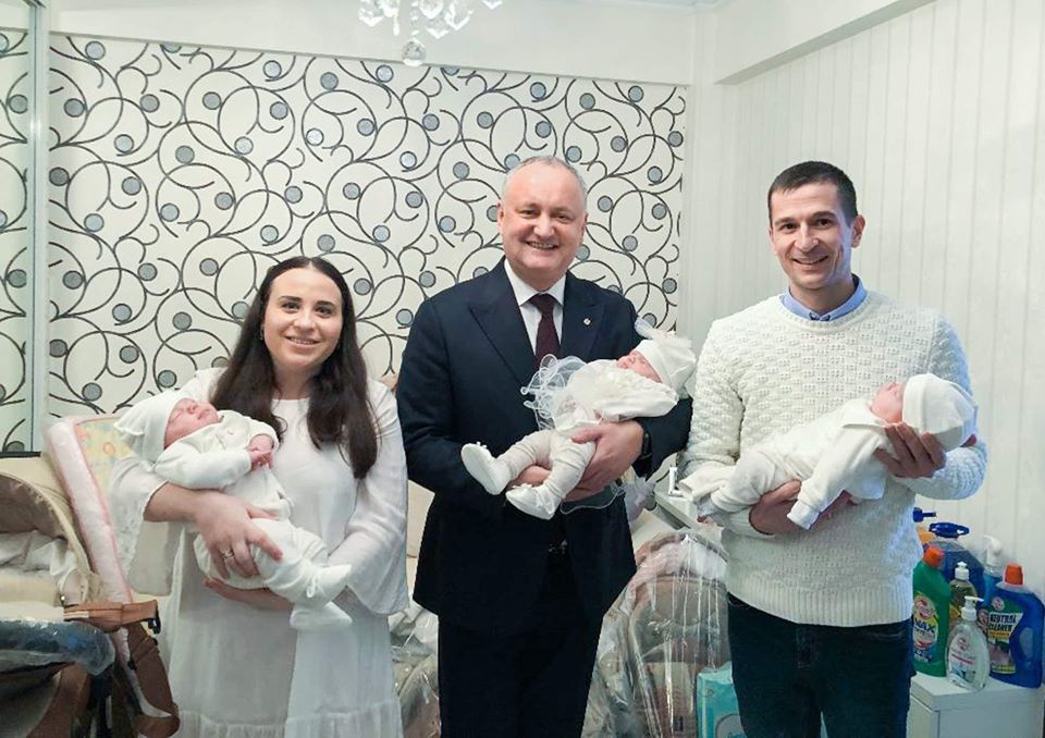 Președintele RM, Igor Dodon, a vizitat azi familia Donțu din municipiul Chișinău, în care recent, s-au născut tripleți – doi băieți și o fetiță și familia monoparentală Brînza din localitatea Budești.