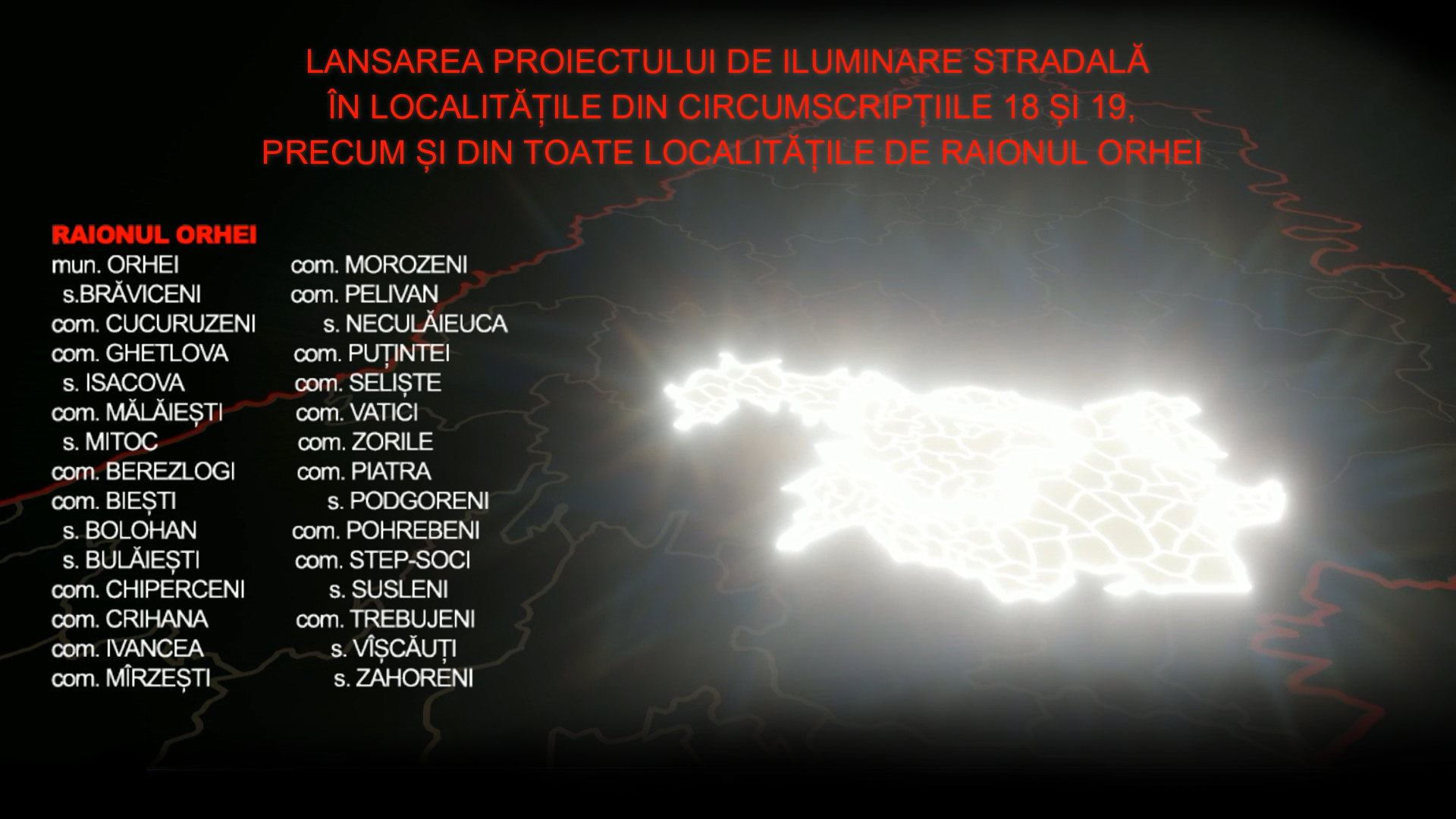 Partidul Politic ȘOR inițiază cel mai de amploare proiect de dezvoltare infrastructurală a Republicii Moldova din ultimii ani. În cele 104 de localități care intră în circumscripțiile electorale uninominale 18 și 19, precum și în toate localitățile din raionul Orhei, începând cu miercuri, 11 aprilie, formațiunea începe instalarea sistemului de iluminat public, a anunțat miercuri liderul partidului, deputatul Ilan Șor. Proiectele infrastructurale vor continua în aceste localități și în următorii ani – vor fi reconstruite drumurile, restabilite instituțiile de învățământ și cele medicale.
