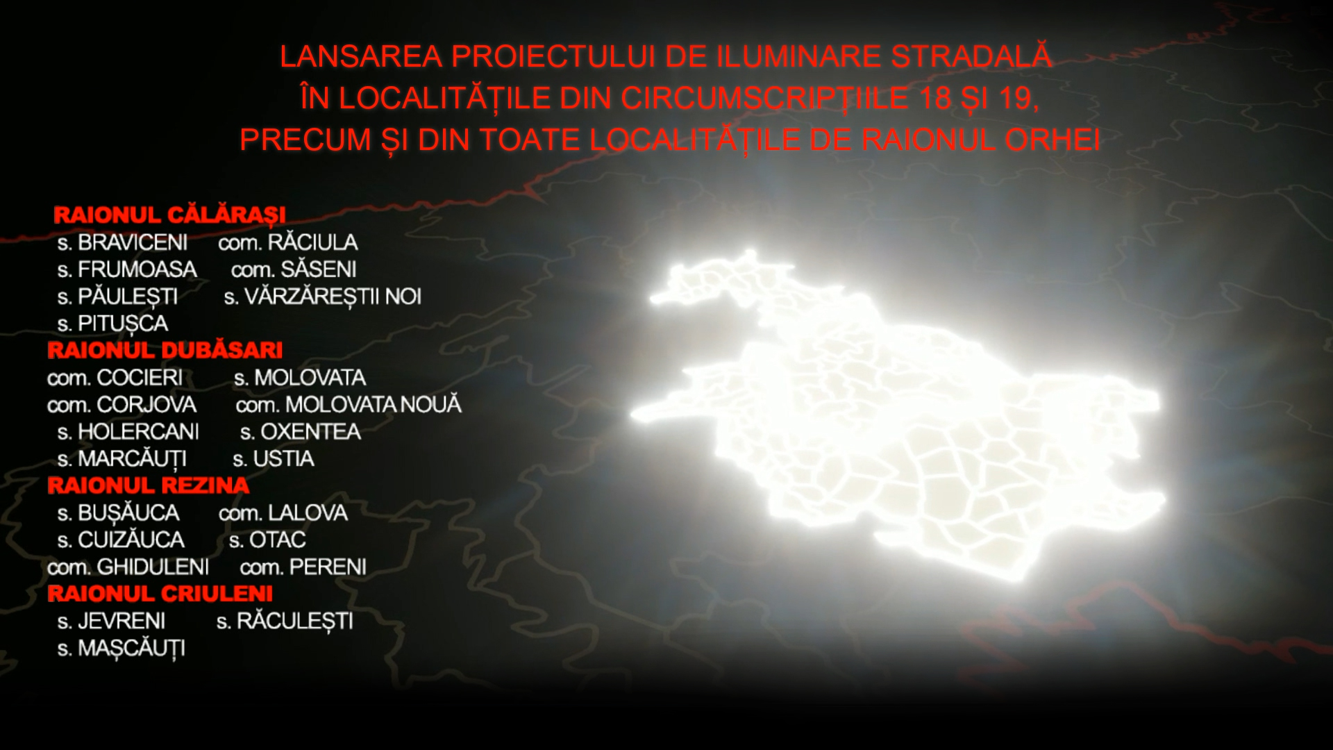 Partidul Politic ȘOR inițiază proiectul său infrastructural de amploare în 104 localități. Este vorba de satele din circumscripțiile uninominale 18 și 19 acolo unde reprezentanții formațiunii au câștigat alegerile (este vorba de sate din raioanele Orhei, Călărași, Rezina, Criuleni, Dubăsari), precum și localitățile din raionul Orhei care nu au intrat în aceste circumscripții.