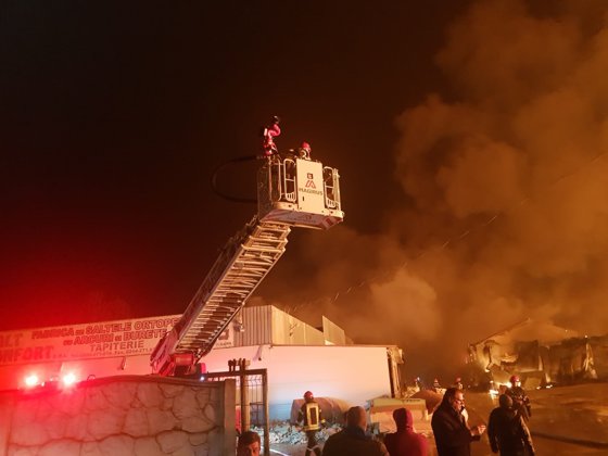 „Este o intervenţie dificilă, pompierii se luptă cu flăcările de peste 9 ore, din cauza cantităţilor mari de materiale combustibile (baloţi de vatelina, utilaje, 2 tiruri şi alte două autoutilitare, saltele, bureţi, lemn, butoaie cu diluanţi şi adezivi), a fumului dens, a temperaturilor ridicate şi a gazelor toxice degajate”, spun pompierii.