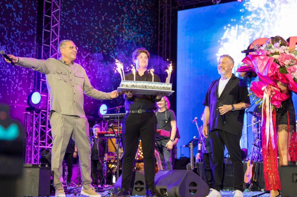 Exact la miezul nopții, scena s-a luminat de focuri de artificii, iar prezentatorul Renato Usatîi i-a pregătit un moment special – un tort imens cu lumânări aprinse.