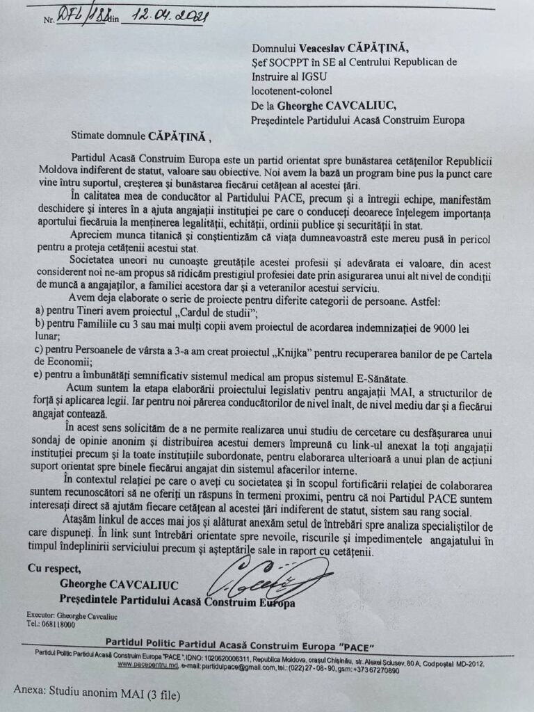 „În calitatea mea de conducător al Partidului PACE, precum și a întregii echipe, manifestăm descindere și interes în a ajuta angajații instituțiile de drept deoarece înțelegem importanța aportului fiecăruia la menținerea legalității, echității, ordinii publice și securității în stat”, a menționat Gheorghe Cavcaliuc, într-un LIVE pe pagina sa de Facebook, în care s-a adresat tuturor oamenilor în epoleți, activi sau în rezervă.
