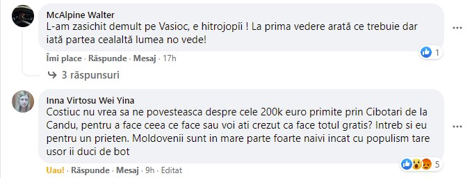 „Costiuc nu vrea să ne povestească despre cele 200k euro primite prin Cibotari de la Candu, pentru a face ceea ce face sau voi ați crezut că face totul gratis? Întreb și eu pentru un prieten. Moldovenii sunt în mare parte foarte naivi încât cu populism tare ușor îi duci de bot”, se spune în comentariul Innei Virtosu.