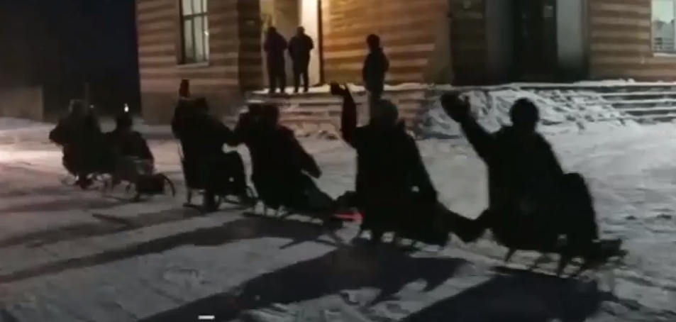 După ce a nins din belşug, oamenii au decis să se bucure de zăpadă. Ei au legat una de alta 25 de sănii cu care s-au plimbat prin localitate.