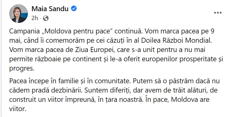 Într-o postare pe rețelele de socializare, Sandu a scris că „Pacea începe în familie și în comunitate. Putem să o păstrăm dacă nu cădem pradă dezbinării. Suntem diferiți, dar avem de trăit alături, de construit un viitor împreună, în țara noastră. În pace, Moldova are viitor”.