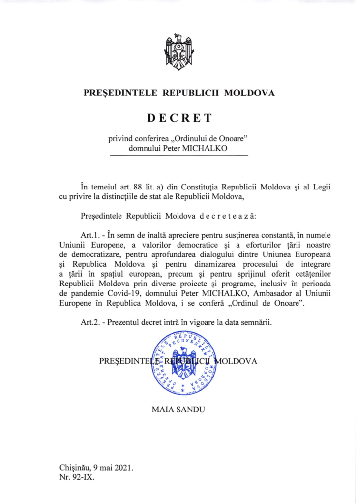Cu prilejul Zilei Europei, președintele Republicii Moldova, Maia Sandu, i-a conferit „Ordinul de Onoare” lui Peter Michalko, Ambasador al Uniunii Europene în Republica Moldova, în semn de recunoștință pentru susținerea constantă oferită cetățenilor Republicii Moldova în eforturile de a trăi în democrație și bunăstare.