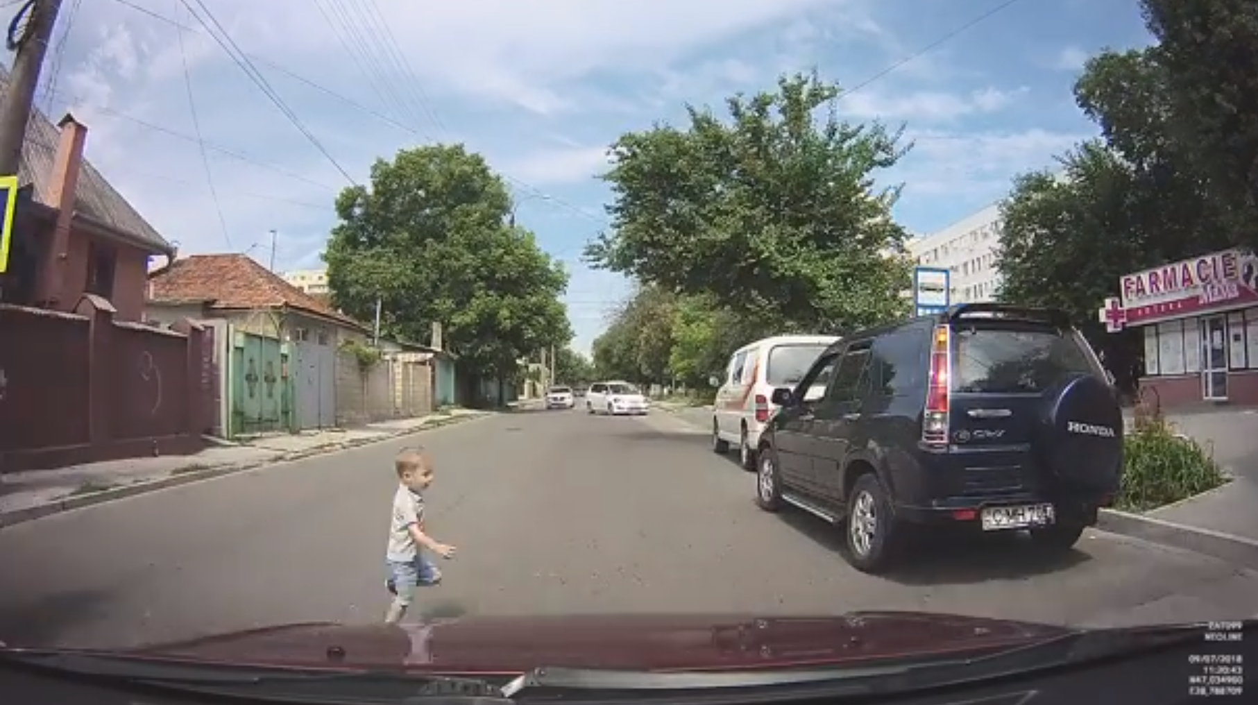 Din imaginile video se observă cum copilul apare brusc de după un microbuz de linie și, fără să se asigure, traversează strada neregulamentar, în alergare. Respectiv, la doar câteva secunde, minorul era cât pe ce să ajungă sub roțile automobilului. Mama minorului a traversat și ea strada pe trecerea de pietoni, îndată după acesta, având un bebeluș în brațe, transmite Realitatea.