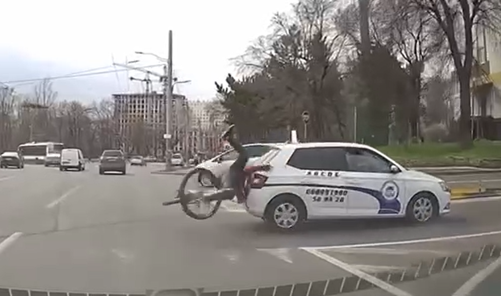 VIDEO // Momentul în care un biciclist se izbește într-o mașină a unei școli auto