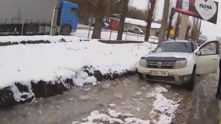 VIDEO // O Dacie s-a împotmolit într-un șanț pe o stradă din Chișinău