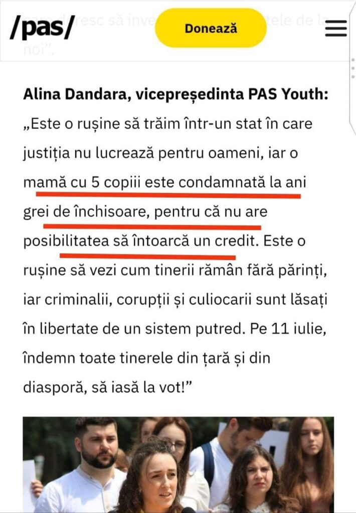 „O mamă cu 5 copiii este condamnată la ani grei de închisoare, pentru că nu are posibilitatea să întoarcă un credit. Este o rușine să vezi cum tinerii rămân fără părinți”, a declarat Alina Dandara, vicepreședinta PAS Youth, în cadrul unui flashmob intitulat „100 de tineri au atenționat asupra problemelor generației lor în Moldova și au prezentat angajamentele PAS pentru tineri”.
