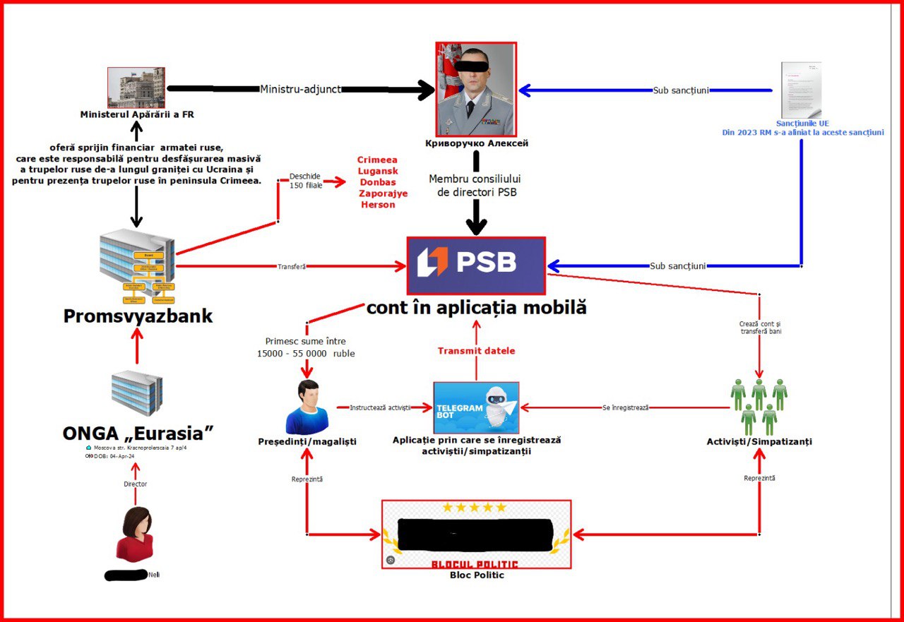 Astfel, reprezentanților partidelor afiliate lui Ilan Șor, le sunt create conturi bancare în banca comercială ,,Promsvyazbank” din Federația Rusă (aflată sub sancțiuni internaționale pentru oferirea de sprijin armatei ruse în războiul din Ucraina), după care, pentru activitatea în folosul partidelor și pentru coruperea electorală în cadrul alegerilor care urmează să se desfășoare, prin intermediul aplicației ,,PSB” le sunt transferate pe conturile acestora sume de bani în ruble rusești, care variază de la 10 000 la 55 000 de ruble (echivalent a 1 975 – 10 870 MDL).
