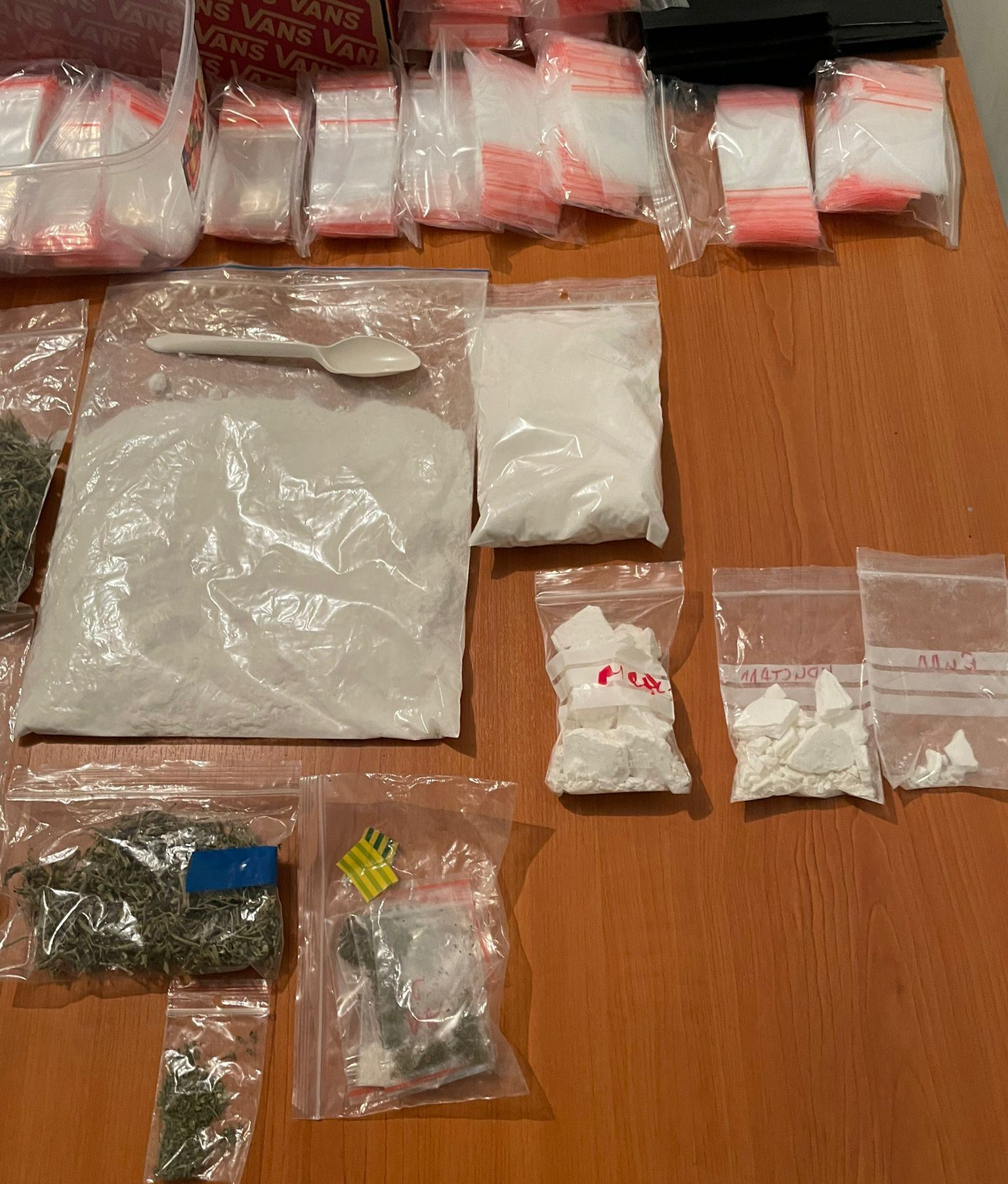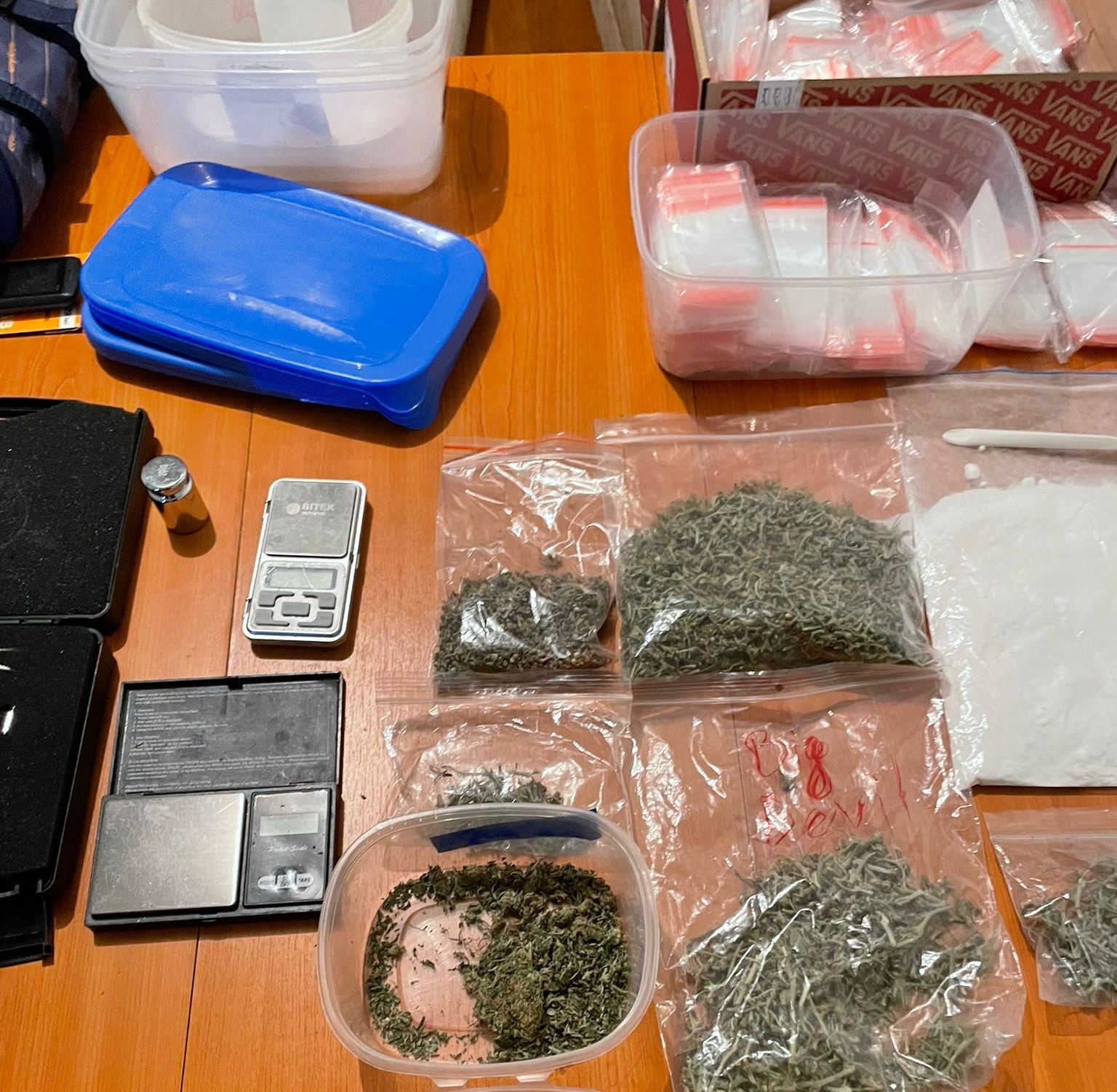 Urmare a perchezițiilor efectuate de polițiști și procurori, la domiciliile și automobilele membrilor grupului, de unde au fost ridicate droguri de diferit tip: marijuana – 700 grame, mefedronă – 600 grame, comprimate ecstasy – 60 la număr, cocaină – 64 grame, PVP (denumită și „sare”) – 30 grame. De asemenea, au fost ridicate 15.000 pachețele autosigilante pentru depozitarea drogurilor, cântare la scară mică, telefoane, cartele bancare, precum și bani, în diferită valută: 18000 lei; 8600 euro; 1000 dolari americani.