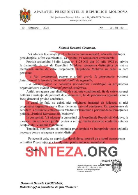 La data de 10 februarie 2021, pe e-mailul redacției am primit răspunsul Secretarului General al Președinției, Andrei Spânu în care s-a menționat că până la momentul actual nu ar exista nici un temei legal pentru a fi retras Ordinul fostului lider democrat, Vladimir Plahotniuc.