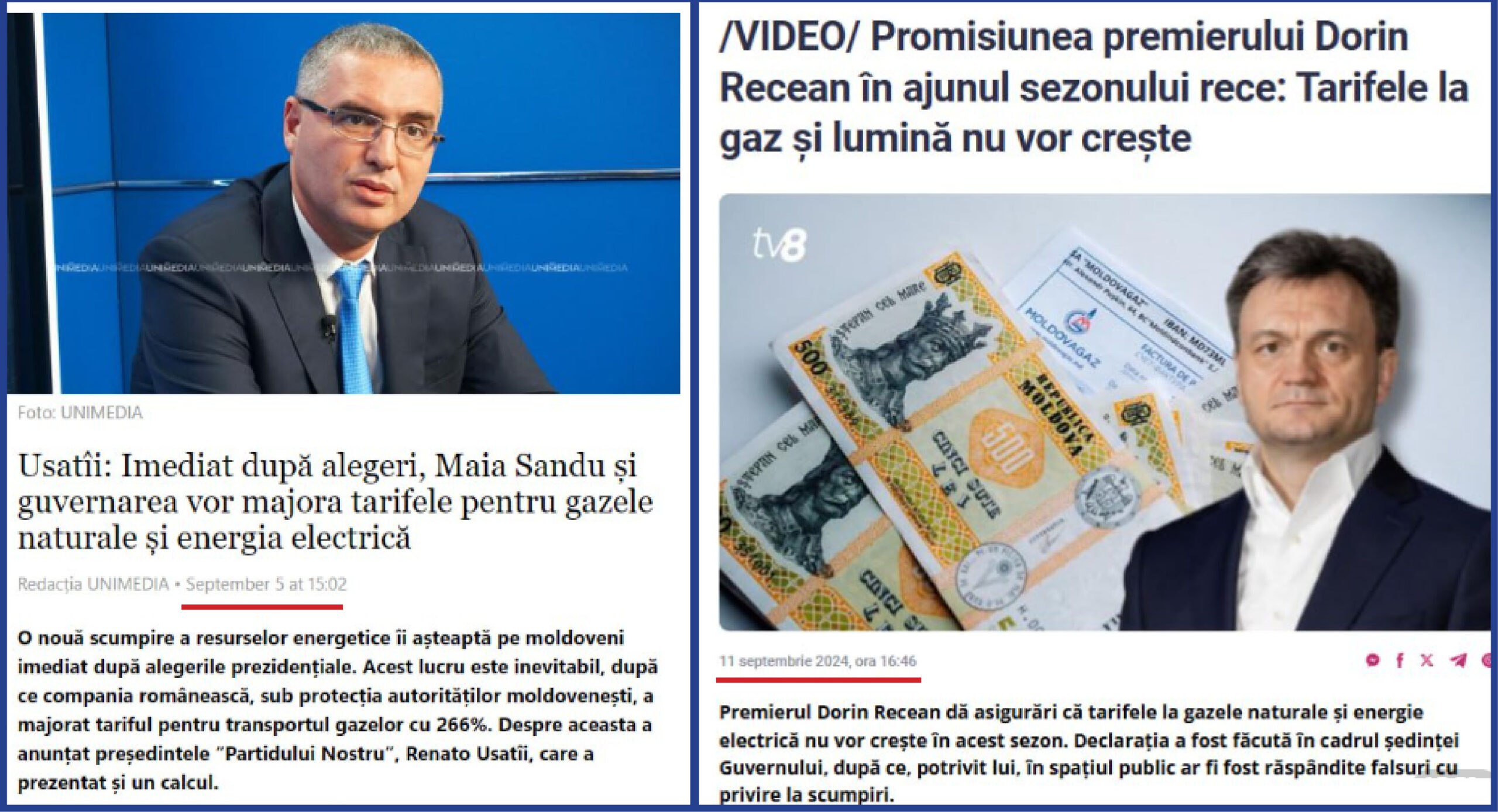 „Ei vor și sunt gata să scumpească nu doar tarifele de transportare, dar pregătesc scumpirea și pentru consumatori, imediat după alegerile prezidențiale”, spunea Renato Usatîi în emisiunea „Puterea e în adevăr” din 5 septembrie. Atunci, premierul Dorin Recean a declarat că aceste informații sunt false.