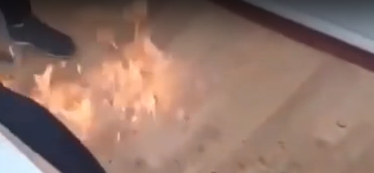 Din imagini se vede cum elevii toarnă dezinfectantul pe podea și îi dau foc. Deoarece conține alcool, flăcările s-au răspândit imediat. Panicați, elevii încearcă să stingă focul cu picioarele.