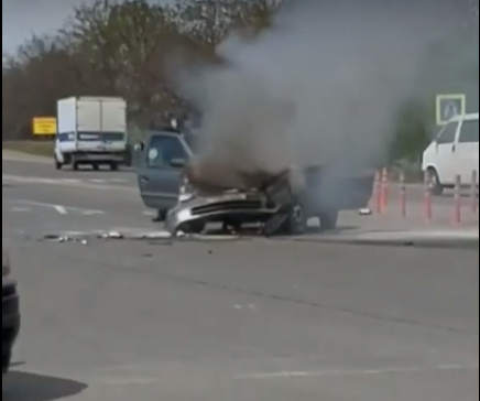 O mașină în flăcări a fost filmată cum arde în mijlocul drumului, la cercul de la Trșușeni, municipiul Chișinău.