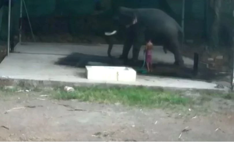 Arun Panikkar, în vârstă de 40 de ani, din Kerala, India, a murit după ce a alunecat sub elefant, iar animalul s-a așezat pe capul lui. Imaginile surprinse de camerele de supraveghere au surprins momentul în care bărbatul spăla elefantul și îl lovea cu băț.