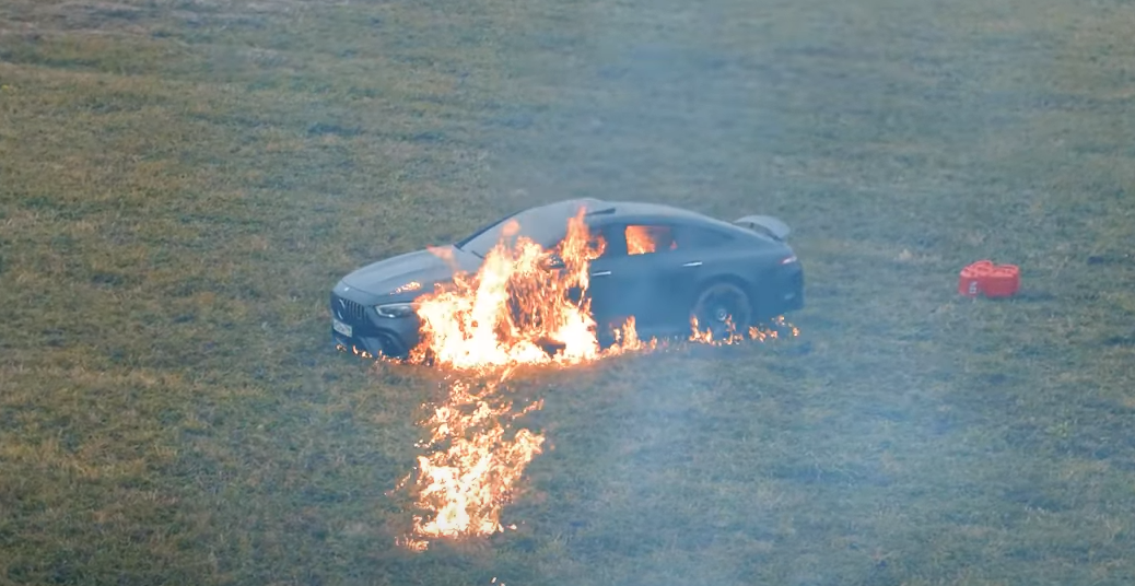 Imaginile pot fi de-a dreptul traumatizante pentru fanii Mercedes-AMG. Filmarea arată coupe-ul cu patru uși cuprins de flăcări. În tot acest timp, posesorul mașinii, Mihail Litvin, se bucură de un grătar și privește impasibil show-ul extrem, la doar câțiva metri de automobilul său.
