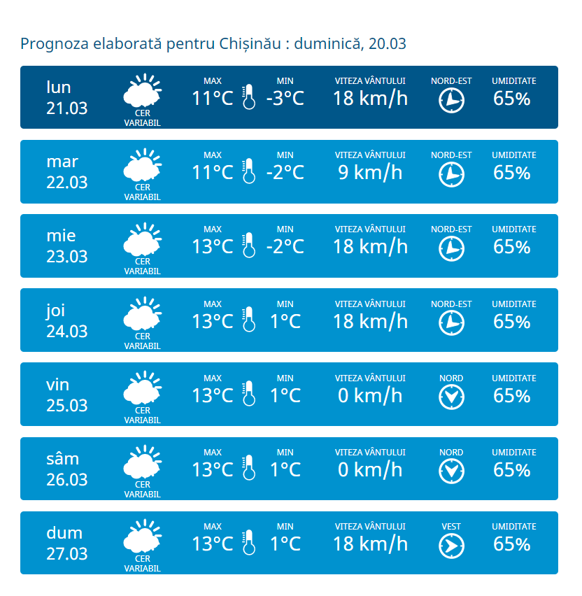 Primăvara își face simțită prezența. Serviciul Hidrometeorologic de Stat anunță temperaturi generoase pe tot parcursul acestei săptămâni. Astfel, începând cu ziua de miercuri, mercurul termometrelor va urca până la 13 grade.