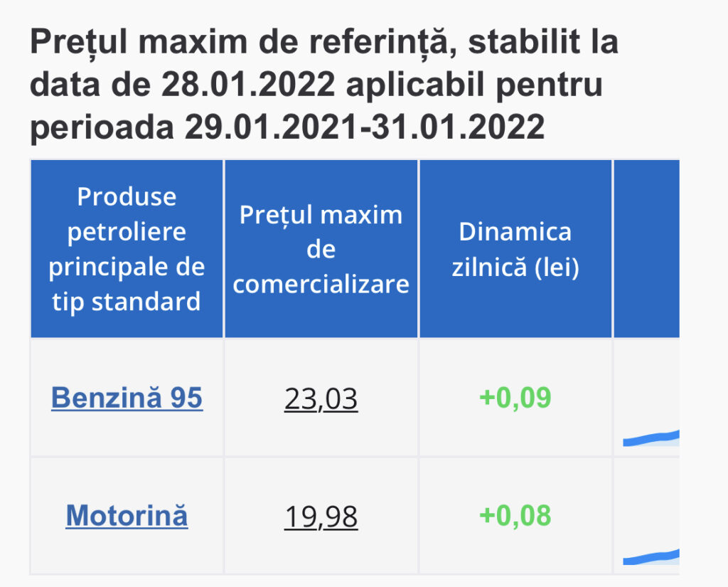Astfel, în ultimele zile de ianuarie, un litru de benzină A 95 va costa 23,03 lei, cu 9 bani mai mult decât vineri, iar un litru de motorină va costa 19,98 lei, ceea ce e cu 8 bani mai mult decât ziua de astăzi.