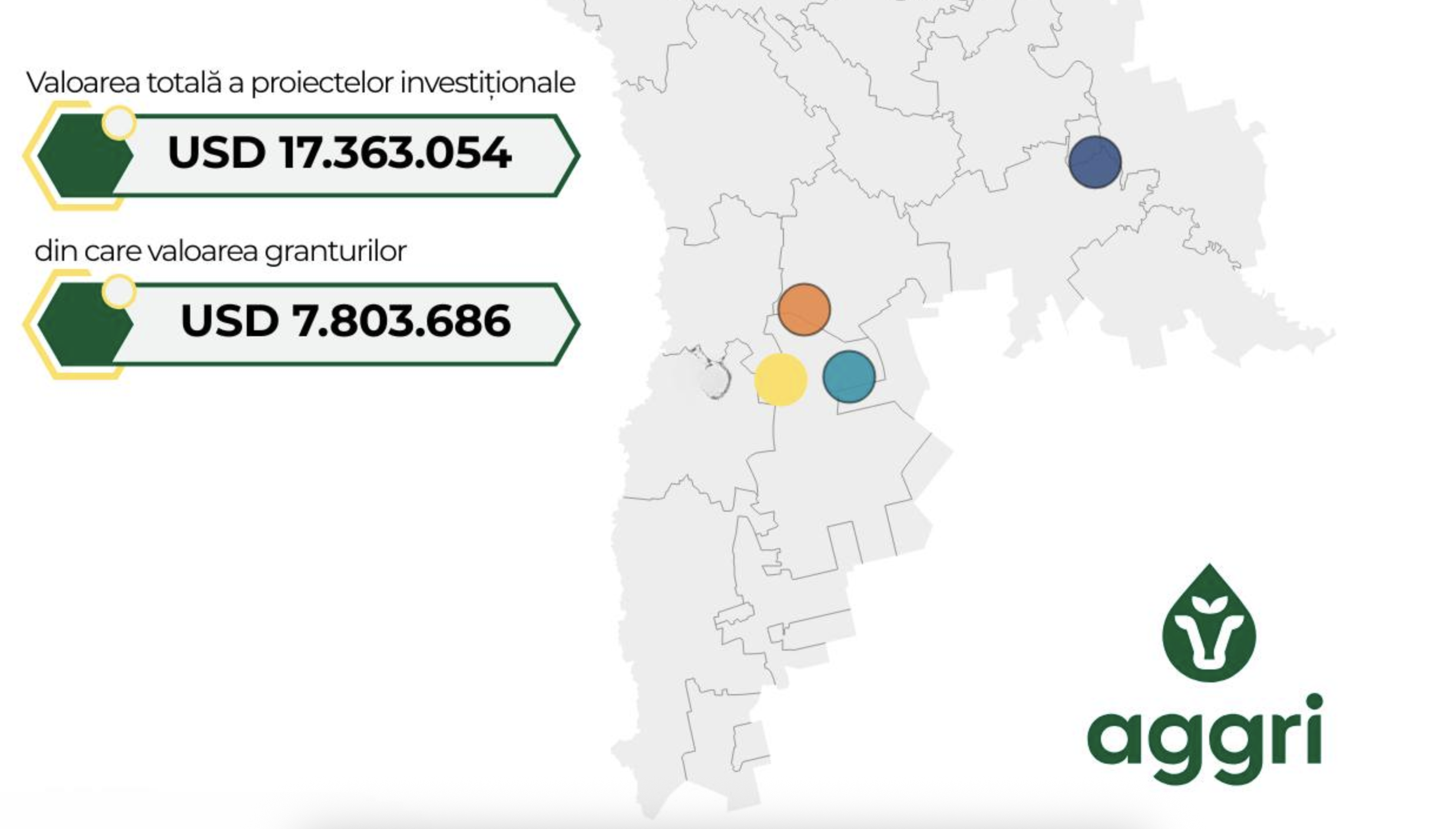 Zece fermieri din Republica Moldova au beneficiat de granturi în cadrul proiectului AGGRI și au reușit să mobilizeze investiții în valoare totală de peste 17,3 milioane USD, din care 7,8 milioane USD reprezintă granturi oferite prin proiectul finanțat de Banca Mondială.